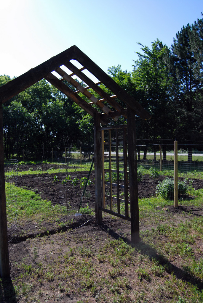 • Randy is building a gate and arched entry for the garden. It’s fantastic, and built will wood we had around here. No new purchases. By the time we get the whole garden done it will be magazine worthy. I consider this picture a halfway done garden. I have a before picture on a post a couple of months ago.